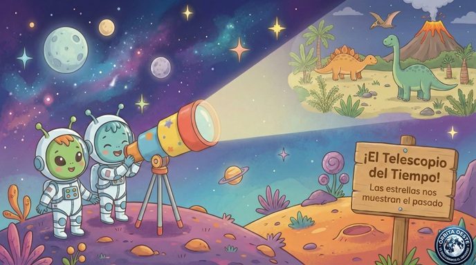 Imagina por un momento que eres uno de esos dos pequeños exploradores que aparecen en la imagen. A tu lado, tu amigo ajusta el Telescopio del Tiempo. No es un telescopio cualquiera; es un ojo que puede ver lo que ya no existe.