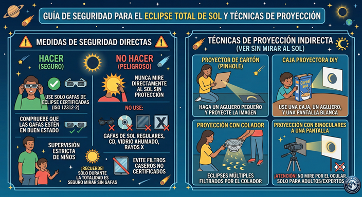 Medidas de Seguridad Directas: En la columna izquierda, encontrarás una lista de lo que debes hacer (seguro) y lo que no debes hacer (peligroso) al mirar el eclipse directamente. Verás que las gafas de eclipse certificadas (ISO 12312-2:2015) son el elemento clave, y se advierte claramente de qué materiales caseros evitar. También se menciona la importancia de la supervisión de adultos y el momento breve de la totalidad. También es muy importante realizar descansos cada poco tiempo al usar las gafas, no usarlas de forma prolongada sin realizar estas paradas para que tu vista se relaje, si notas fatiga ocular alarga los descansos.