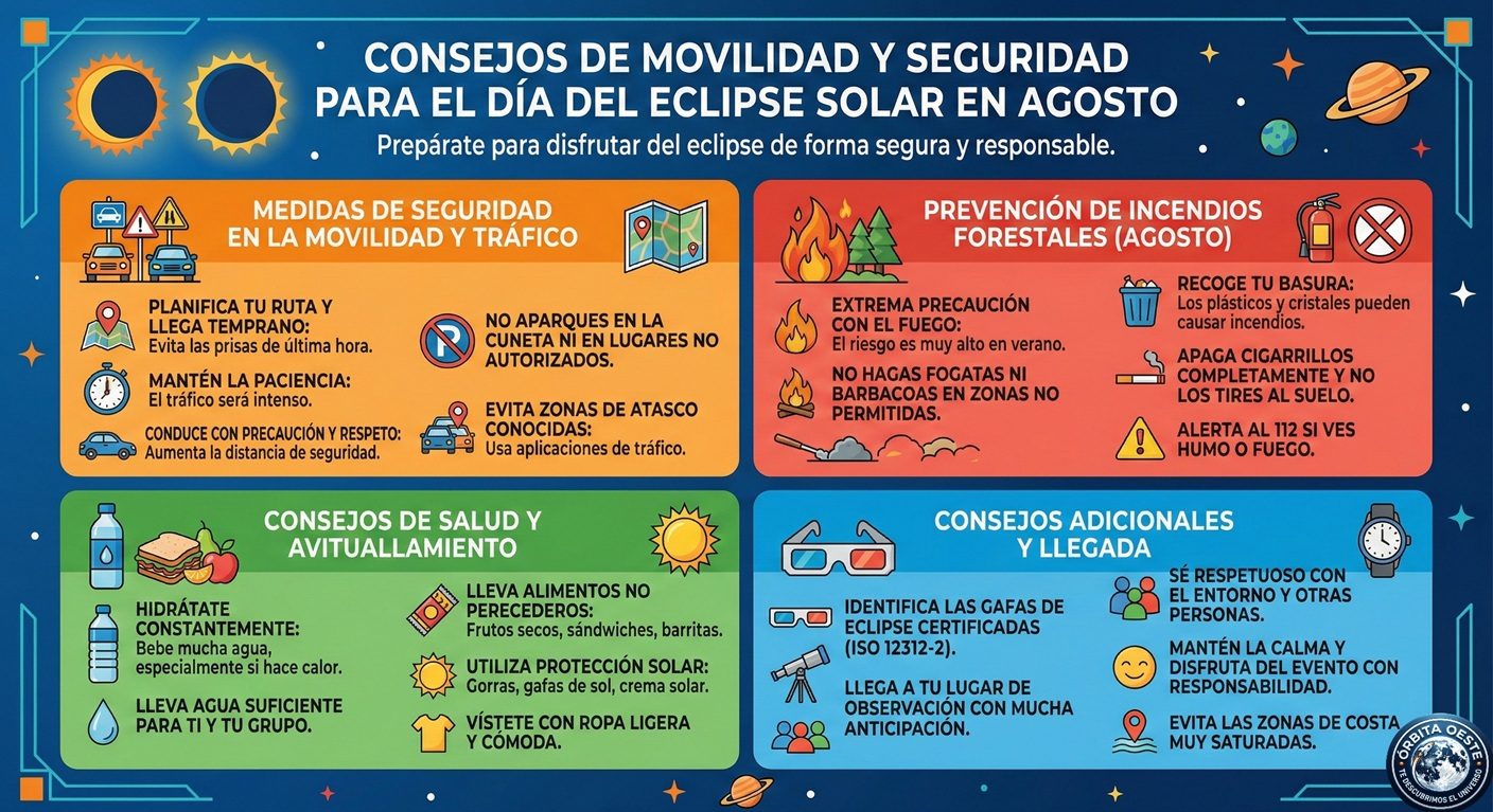 Además de las medidas de seguridad en cuanto a la observación en si del eclipse, te dejo unos consejos referentes a la planificación, movilidad, avituallamiento y precuación ante incendios. Recuerda que va a ser un evento muy masivo, en pleno mes de agosto.