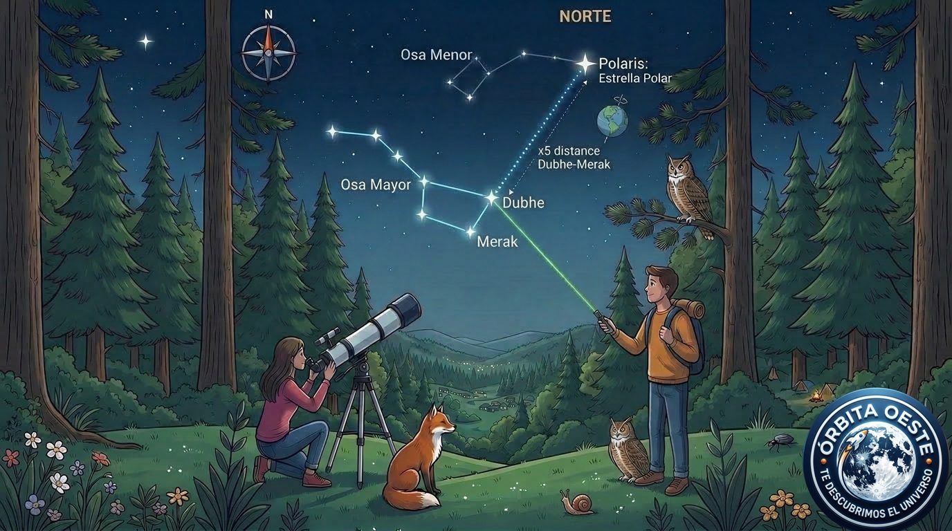 El Gran Salto al Norte: Ahora, como un maestro Jedi celestial, imagina proyectar una línea recta que une Merak y Dubhe y se extiende hacia arriba. Esta línea es nuestra brújula de luz. Como indica nuestra imagen con una línea de puntos y flecha, debes extender esa distancia aproximadamente cinco veces en la misma dirección.